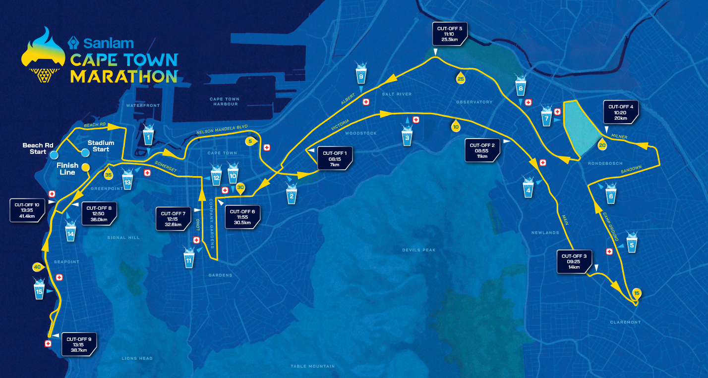 El maratón se disputa en un recorrido rápido y llano, con salida y llegada en Green Point, cerca del Estadio de Ciudad del Cabo. Otras distancias incluyen carreras en ruta de 5 km y 10 km, y tres carreras de trail de 11/12 km, 22 km y 46 km, añadidas en 2021 como el Maratón de Trail de Ciudad del Cabo.